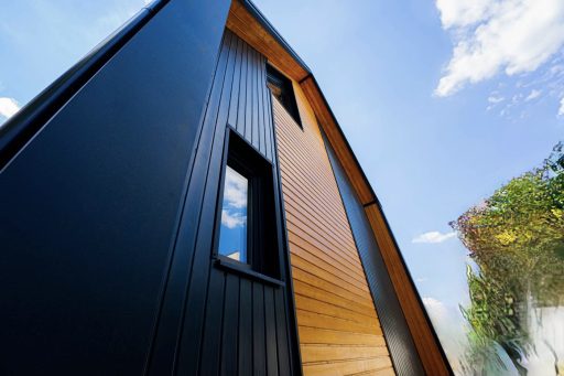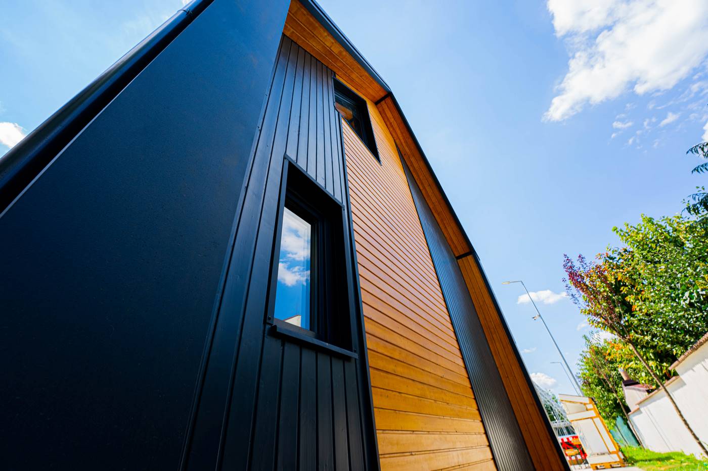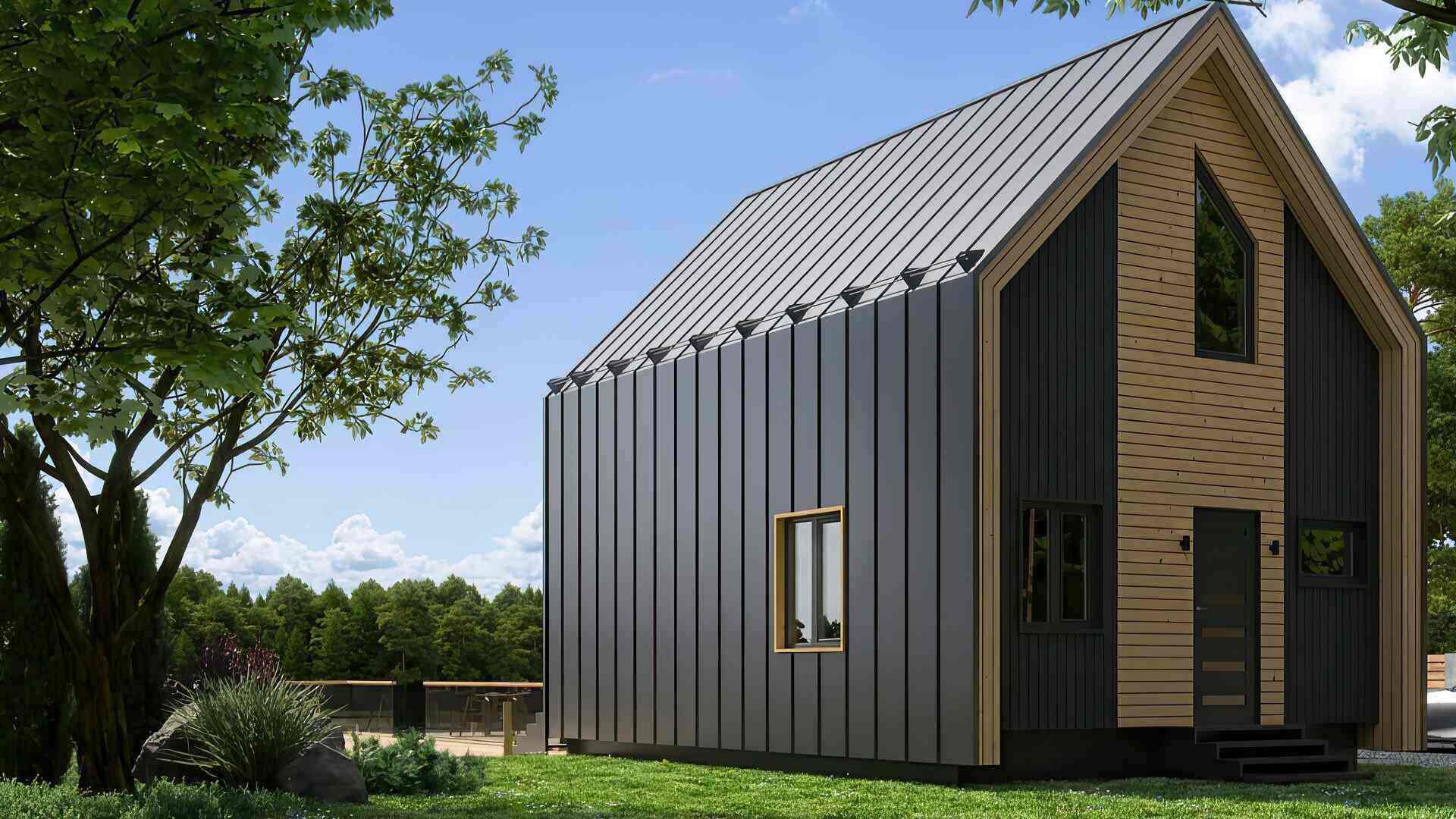 - Los revestimientos exteriores de fachada de la casa están hechos de abeto y de chapa Iron Click en color antracita mate (RAL 7016) del fabricante polaco Budmat. La chapa Iron Click es un producto innovador y mejorado técnicamente, que ofrece unas características únicas que incluyen un nuevo cierre reforzado que proporciona conexiones longitudinales más precisas y duraderas, un perfilado innovador que hace que el borde de cobertura del cierre sea invisible y copas de montaje especiales en las juntas longitudinales para garantizar una dilatación adecuada de los paneles.