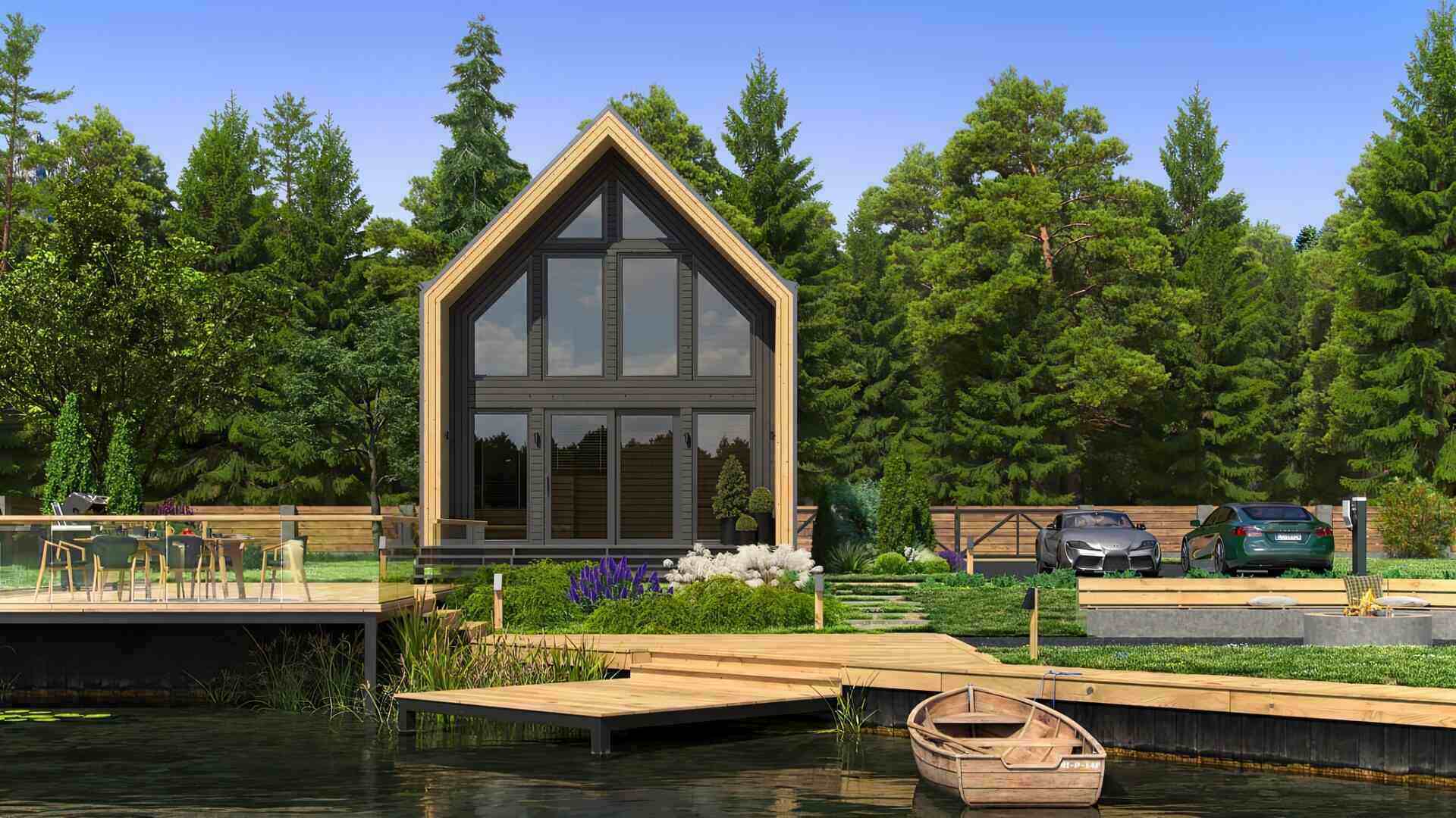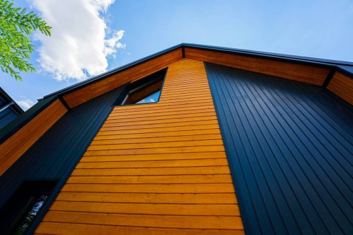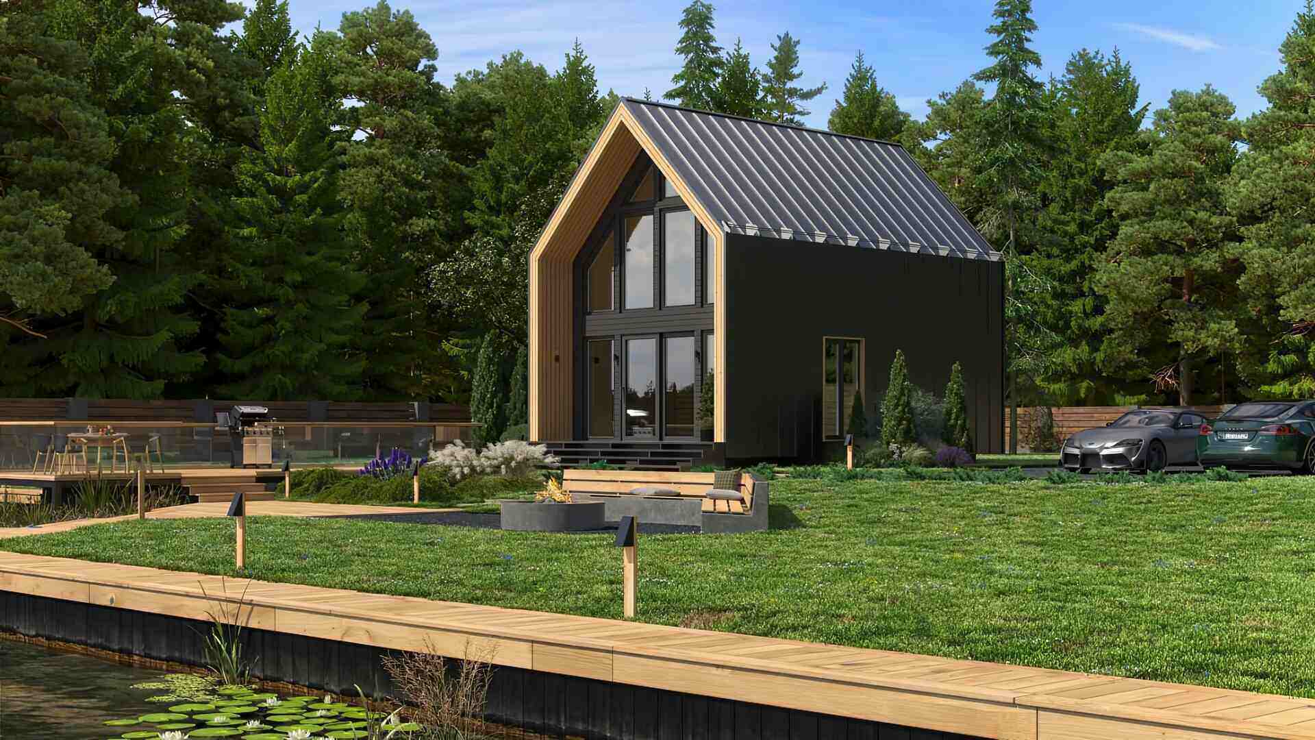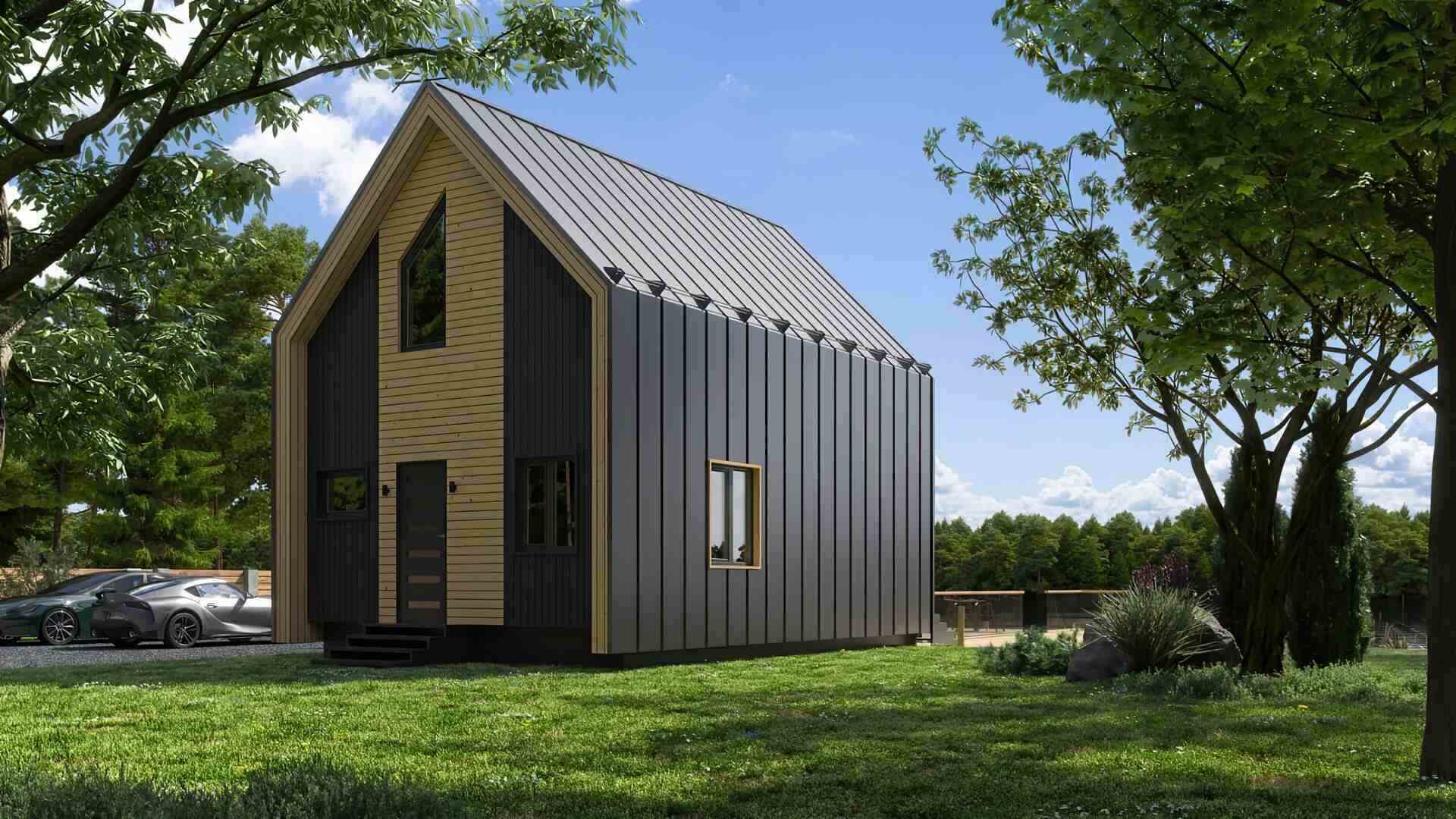- Los revestimientos exteriores de fachada de la casa están hechos de abeto y de chapa Iron Click en color antracita mate (RAL 7016) del fabricante polaco Budmat. La chapa Iron Click es un producto innovador y mejorado técnicamente, que ofrece unas características únicas que incluyen un nuevo cierre reforzado que proporciona conexiones longitudinales más precisas y duraderas, un perfilado innovador que hace que el borde de cobertura del cierre sea invisible y copas de montaje especiales en las juntas longitudinales para garantizar una dilatación adecuada de los paneles.