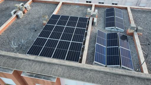 Mientras que el campo fotovoltaico de la derecha, orientado este-oeste, ha sido ejecutado con estructuras de hormigón autolastradas Solarbloc (la opción más habitual en cubiertas planas como la que nos ocupa), en la de la izquierda hemos diseñado una estructura metálica a medida para elevar ligeramente los paneles.